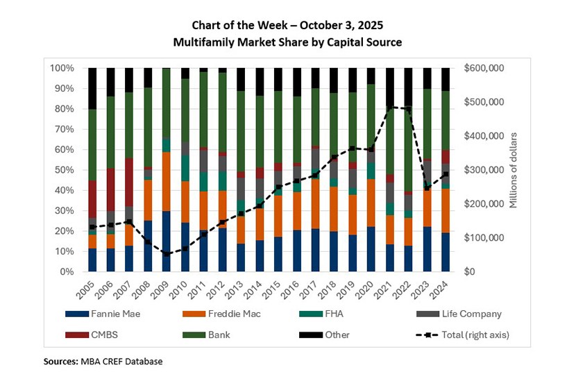 This Chart of the Week focuses on the distribution of the multifamily market share by capital source. The multifamily market is a fundamental part of the broader commercial real estate market, and originations have been strong throughout 2025. The figure reports MBA estimates of the shares of originations by each capital source, overlaid with total multifamily origination volumes.