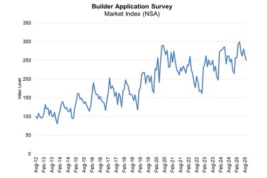 The Mortgage Bankers Association Builder Application Survey data for September 2025 shows mortgage applications for new home purchases increased 2% compared from a year ago. Compared to August 2025, applications decreased by 5%. This change does not include any adjustment for typical seasonal patterns.