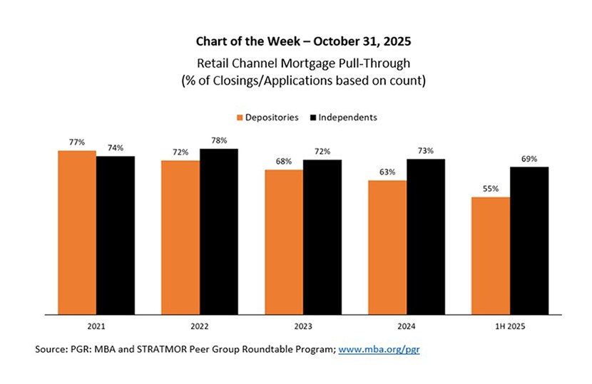 While industry volume is forecast to increase modestly over the next three years, a key determinant of cost and productivity improvements moving forward is borrower fallout, as measured by the pull-through percentage of total loan closings to total applications in a given time period. In this Chart of the Week, data from the MBA and STRATMOR Peer Group Roundtables Program (PGR) show that pull-through in the Retail Channel declined from 2021 through the first half of 2025. For depositories, the pull-through percentage hit 55% in the first half of 2025, the lowest level reported in the PGR survey since 2000. The independents’ pull-through was generally better compared to depositories, but still dropped to 69% in the first half of 2025 – the lowest level since 2012. The data suggest that lenders are spending time, energy and money on loan applications that simply do not close. If leads and preapprovals were included along with full applications, the pull-through percentage would be even lower.