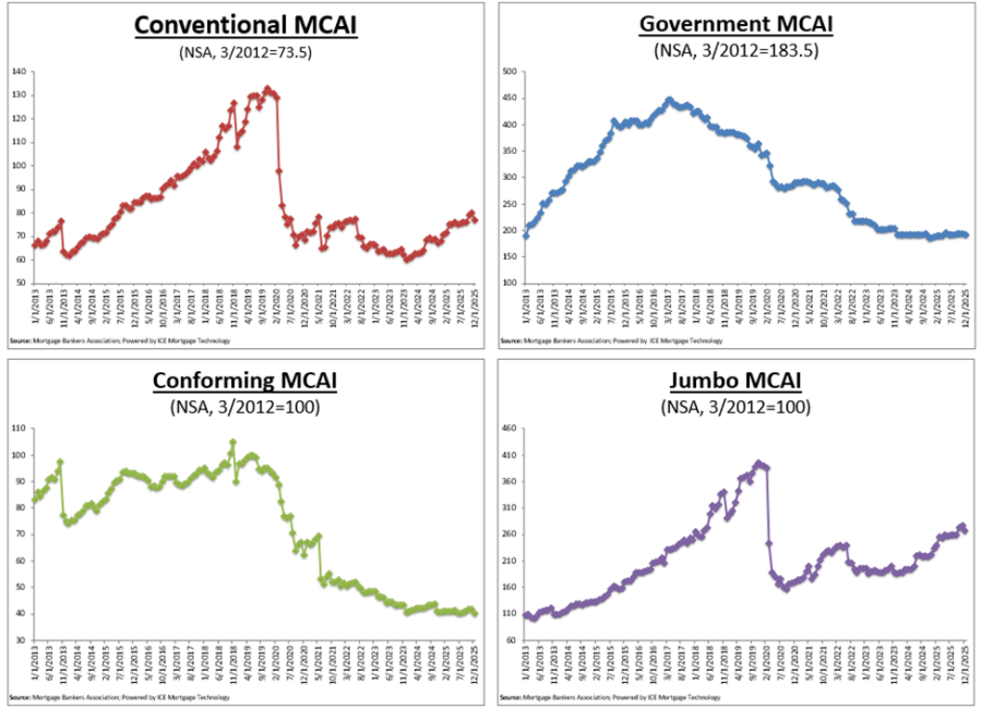 The MCAI fell by 2.6% to 104.7 in December. The Conventional MCAI decreased 3.6%, while the Government MCAI decreased by 1.4%. Of the component indices of the Conventional MCAI, the Jumbo MCAI decreased by 3.6%, and the Conforming MCAI fell by 3.8%.