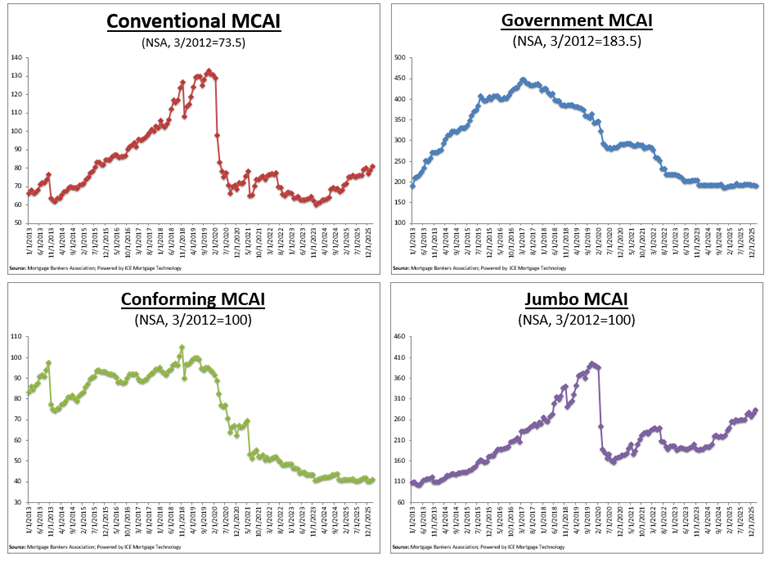 The MCAI rose by 1.1% to 107.1 in February. The Conventional MCAI increased 2.7%, while the Government MCAI decreased by 0.8%. Of the component indices of the Conventional MCAI, the Jumbo MCAI increased by 2.9%, and the Conforming MCAI rose by 2.0%.