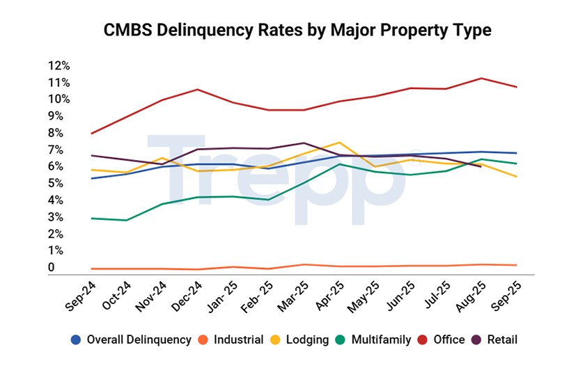 The majority of property types saw their delinquency rates fall in September. Only retail saw an increase, up 34 basis points to 6.76% after a spate of declines.