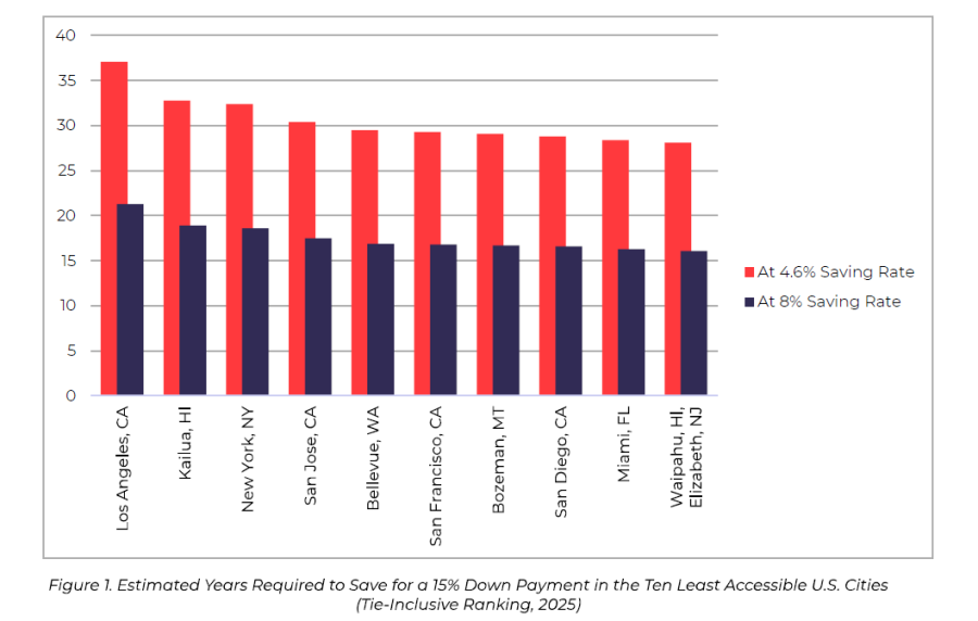 The firm examined 250 cities across the country. It analyzed city-level home values, household incomes and saving-rate assumptions to identify the markets where households face the longest timelines to accumulate a 15% down payment.