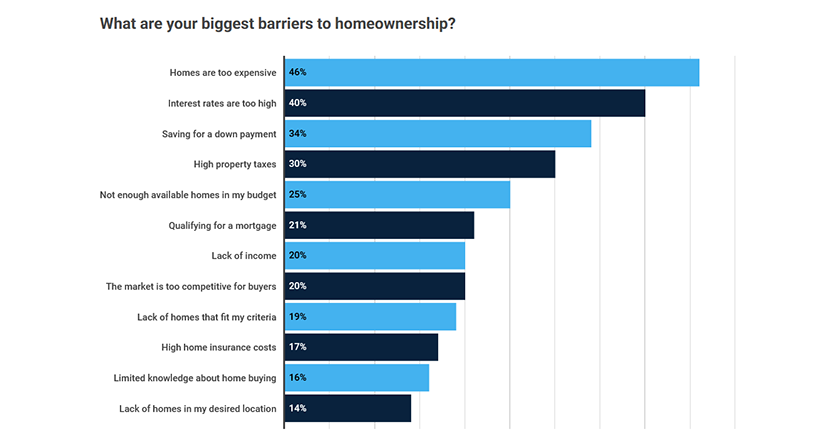 Financial hurdles top millennials’ home-buying challenges, with the most common barriers being expensive homes (46%), high interest rates (40%), difficulty saving for a down payment (34%) and high property taxes (30%).