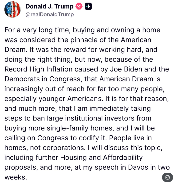 Ahead of an expected announcement in the coming weeks on “housing affordability policy actions,” President Donald Trump on Wednesday in a social media post (see image above) said that he is “immediately taking steps to ban large institutional investors from buying more single-family homes,” and that he will be “calling on Congress to codify it.” He also said that he will discuss this topic and more in his upcoming speech at the World Economic Forum’s (WEF) Annual Meeting on Jan. 19-23 in Davos-Klosters, Switzerland.