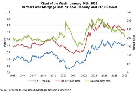 The spread between mortgage rates and Treasury rates is impacted by several factors, including the level of interest rate volatility and the relative demand/supply balance of the two types of securities. In recent months, rate volatility has diminished, as the future course of monetary policy has become clearer and financial markets have been relatively calm. Last week’s announcement that the GSEs will increase their purchases of MBS brought the spread in further, and mortgage rates dropped further over the course of the week.