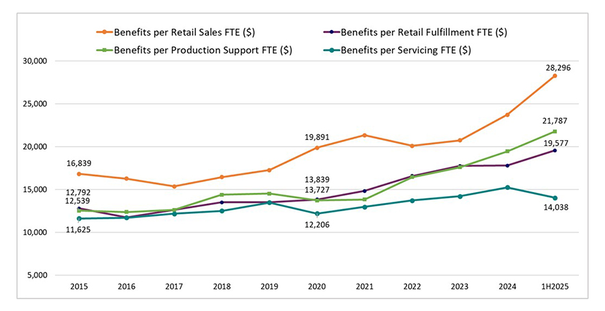 Benefits costs per FTE for retail sales personnel averaged over $28,000 in the first half of 2025, a 68% increase over the ten-year period, with steeper escalations in more recent years. Fulfillment and production support also trended upward, particularly in the last five years that saw costs increase by 59% and 41% respectively. The least substantive change in benefits was for servicing functions, in which costs averaged $14,038 in the first half of 2025 from $11,625 per servicing FTE in 2015 – an increase of 21%. The movement of permanent servicing employees offshore may explain the relatively moderate increase in servicer-paid benefits costs.